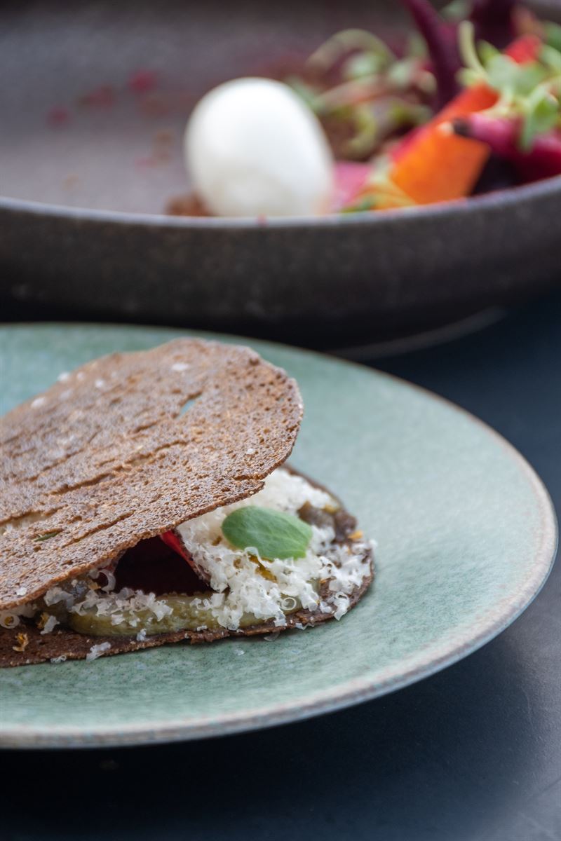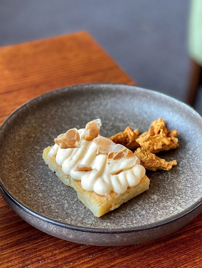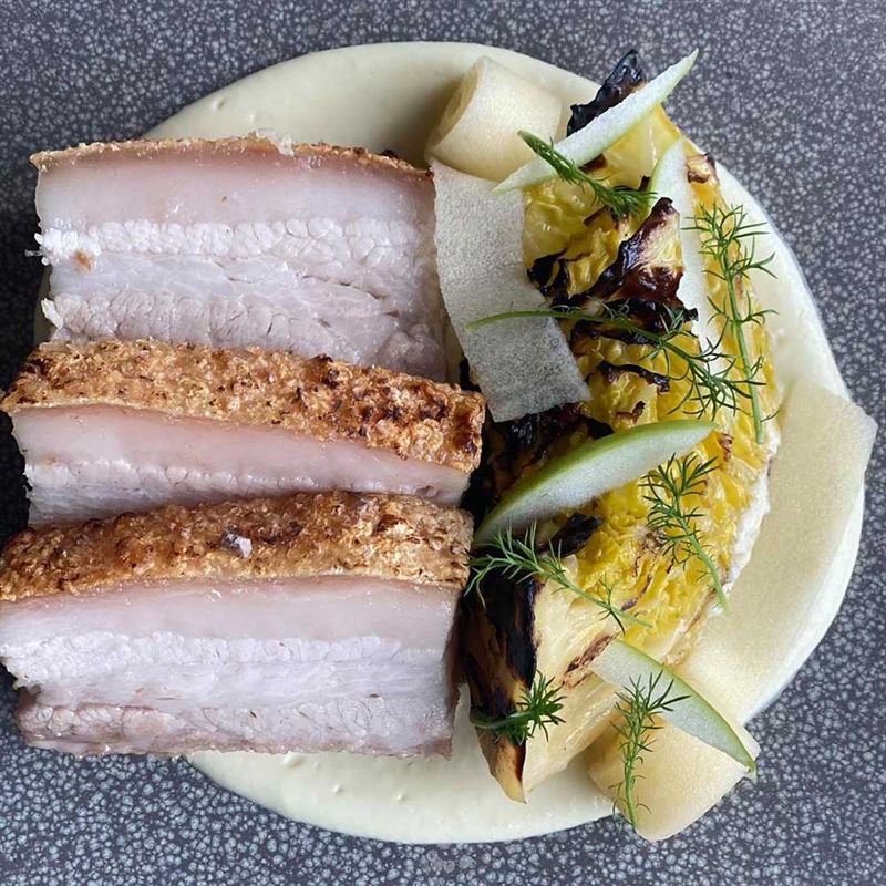Confit pork belly, peach chutney, chimichurri and parsnip crisps.