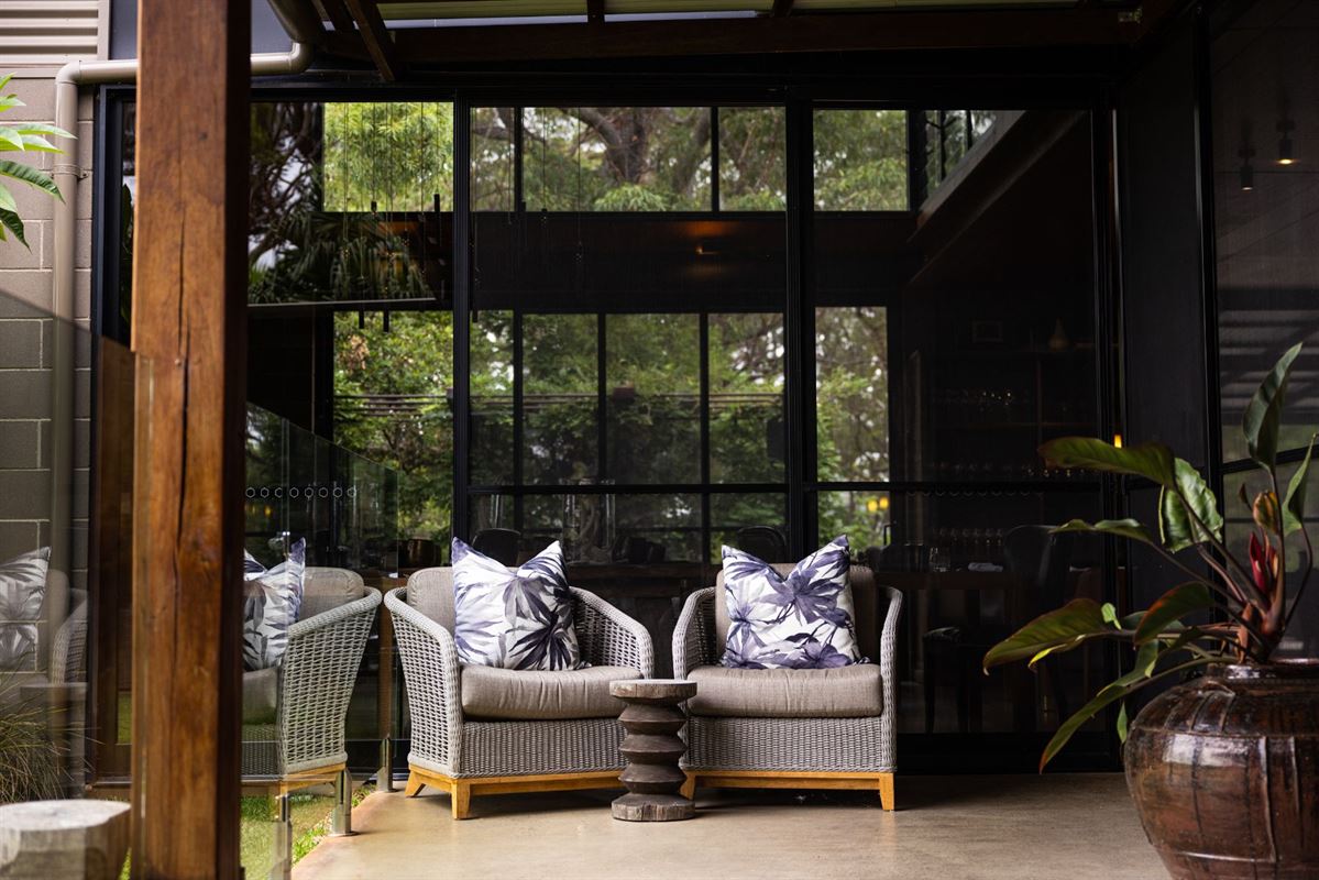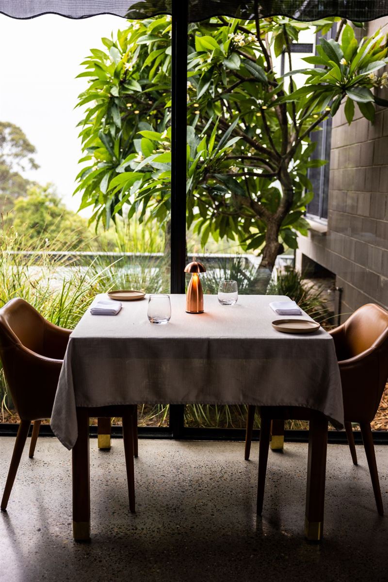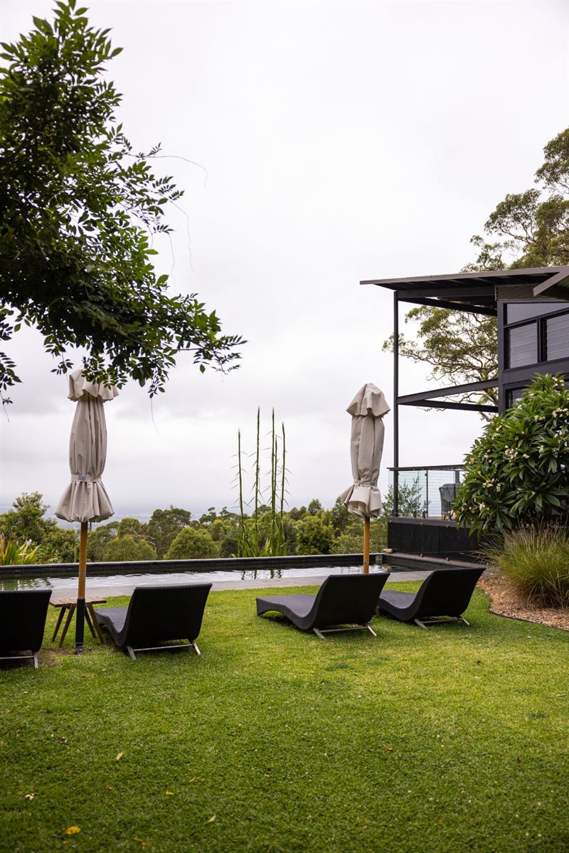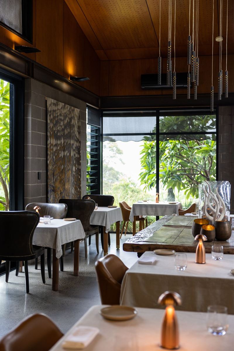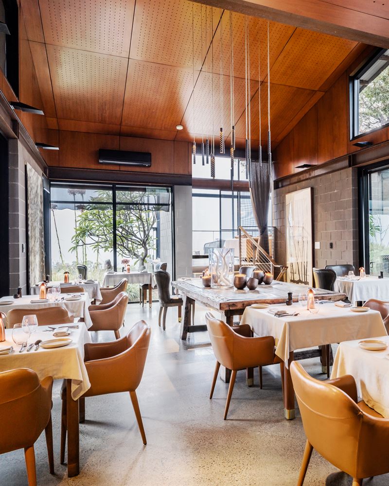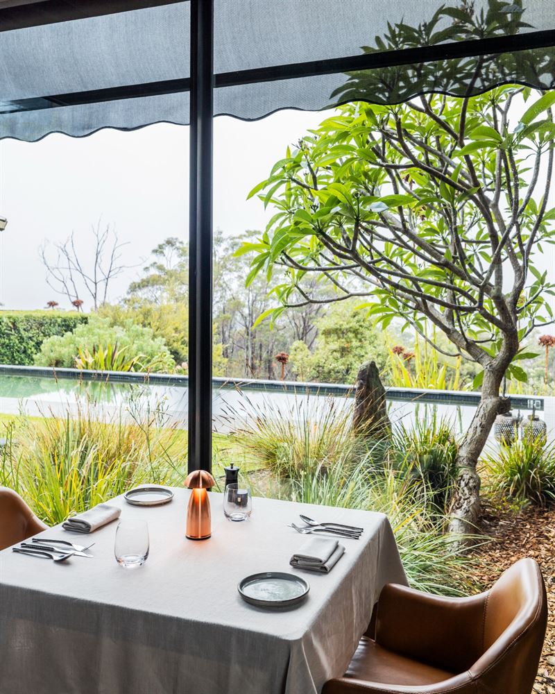 Discrete, private entry to the gated Sangoma Retreat and intimate Amara Restaurant is by appointment only to guarantee a spacious, unrushed atmosphere that's in tune with your needs. Each reservation of visitors is greeted by their host, Ivy or John, and are ushered to the top lounge for welcome drinks. When ready, guests are then seated at their table in Amara for a unique culinary experience looking out over Sydney framed by the Blue Mountains.