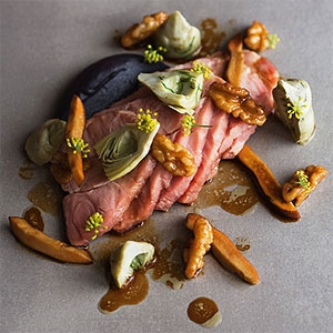 Pork Neck with Pine Mushrooms and Purple Congo Potato Puree