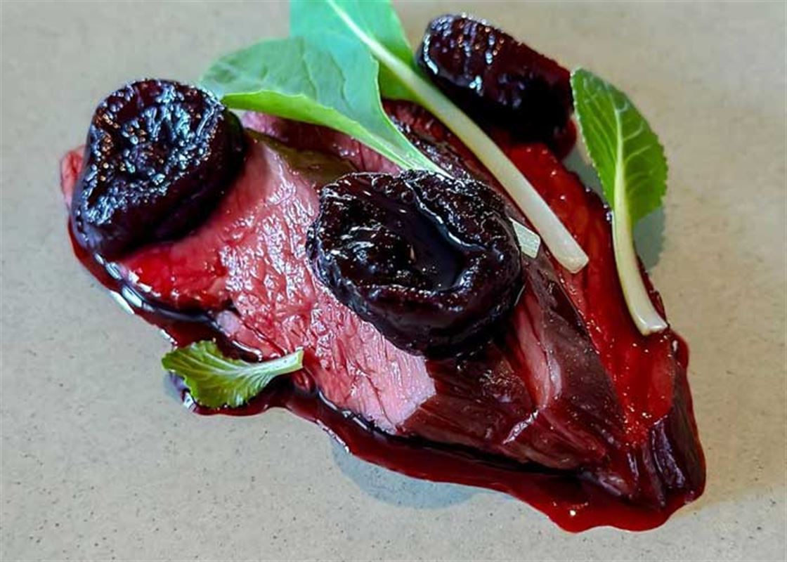 Wild shot fallow deer and black pearl mushrooms, grilled onion and asparagus.