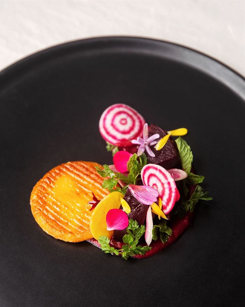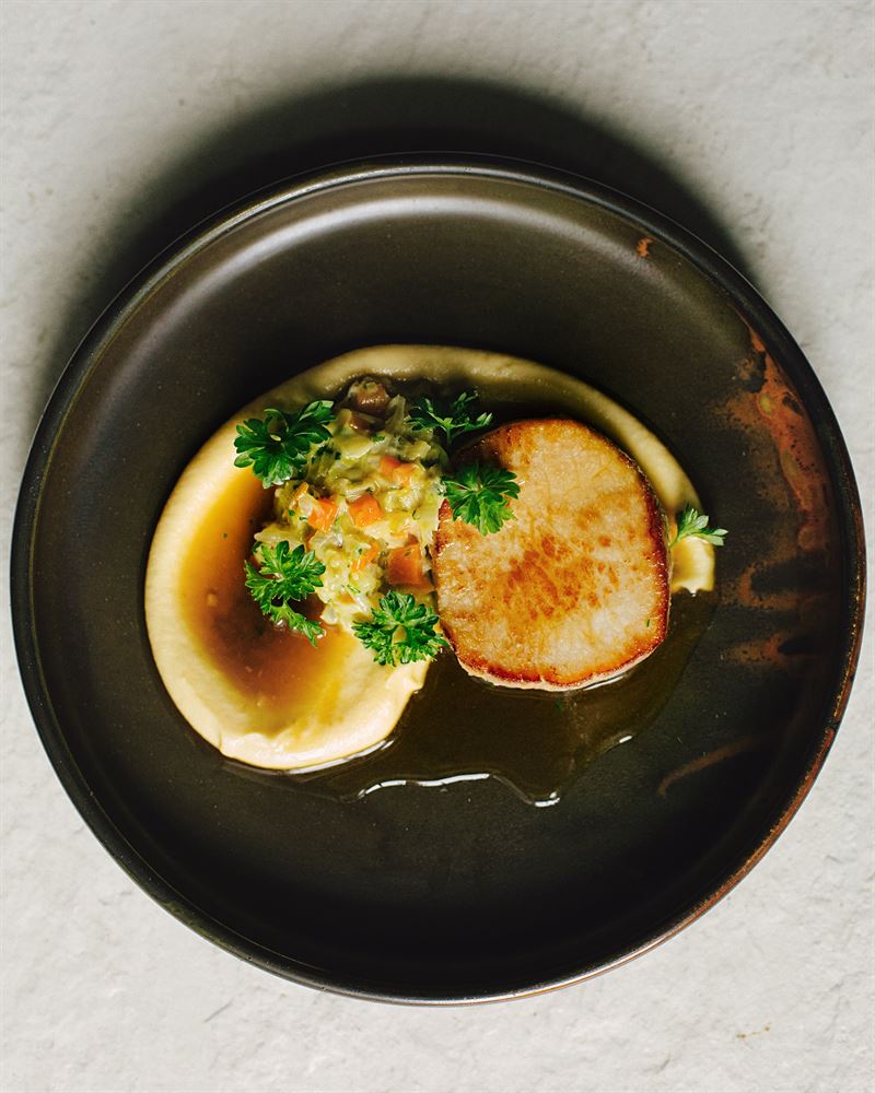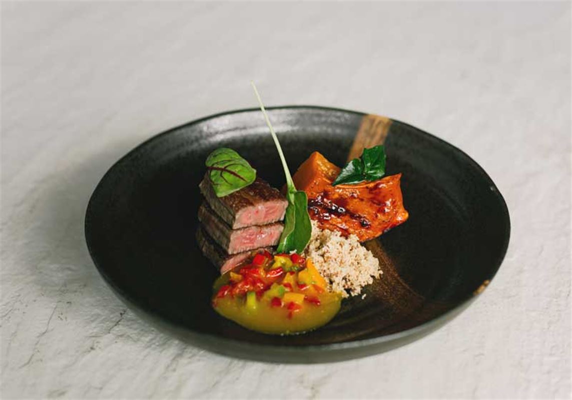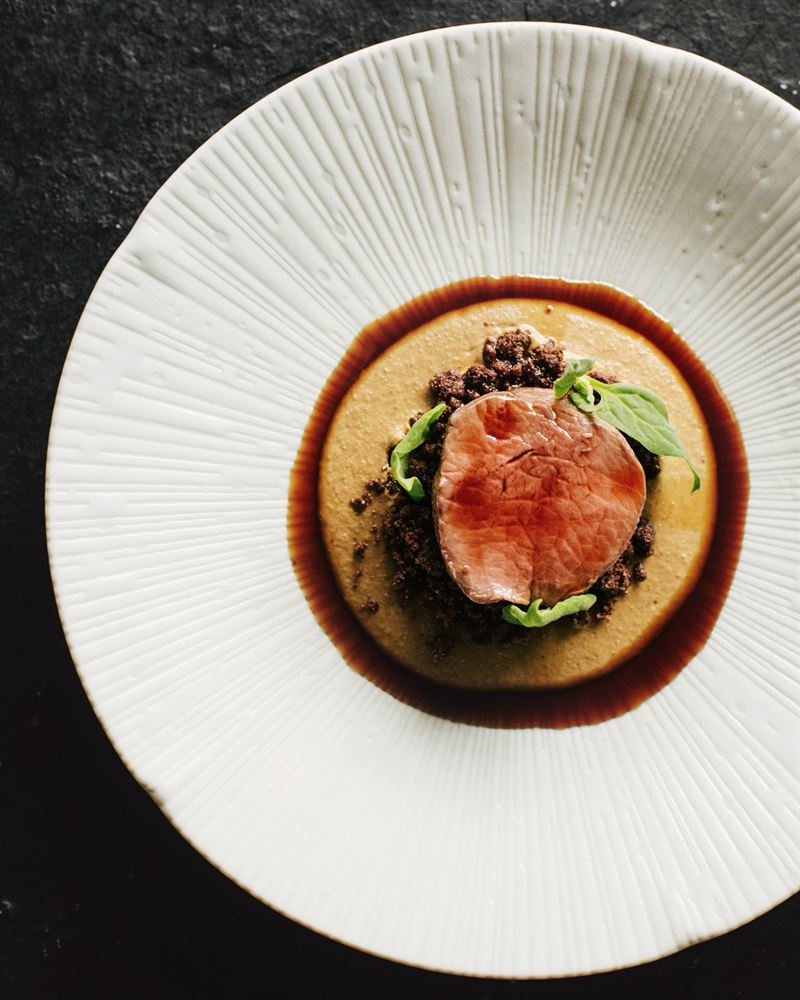 Venison backstrap, muntries purée, chocolate soil, pepperberry and lemon myrtle jus.