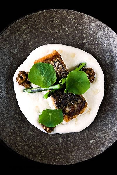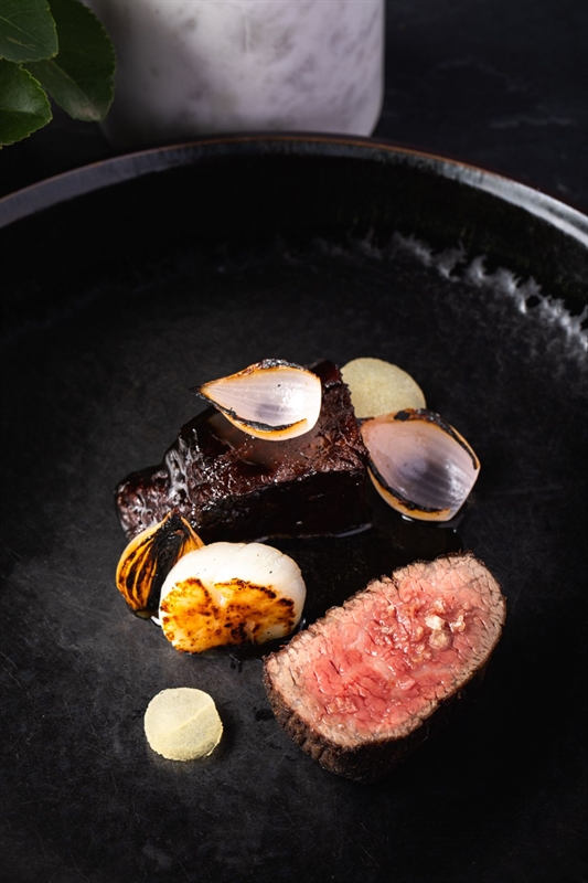 Wagyu tenderloin, smoked short rib, peas, onion and lovage.