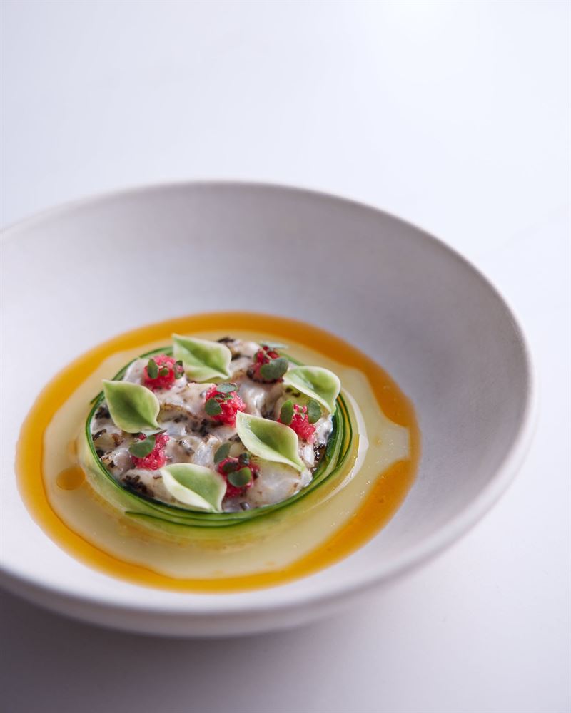 This dish is a celebration of local produce, bringing together the sweetness of scallops with fresh finger limes and lime crème fraiche, balanced by the acidity of pickled radish. Buttermilk and crème fraiche provide a creamy base, while salted kombu and anise from fennel pollen add depth and complexity to the dish.