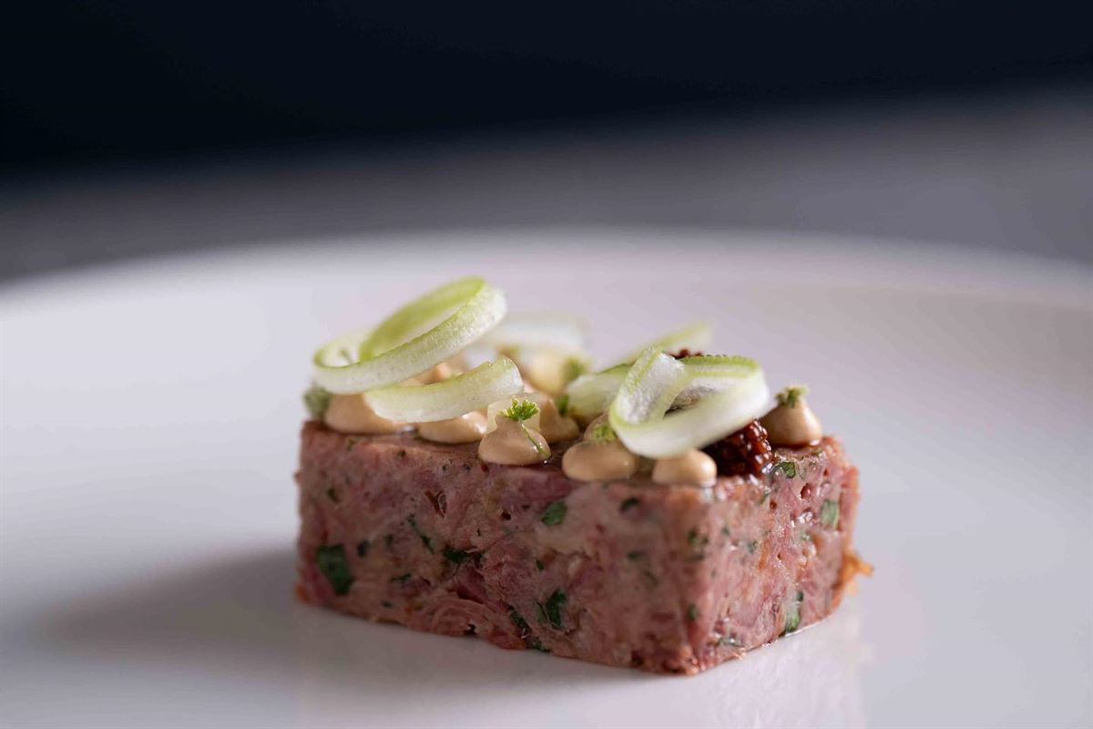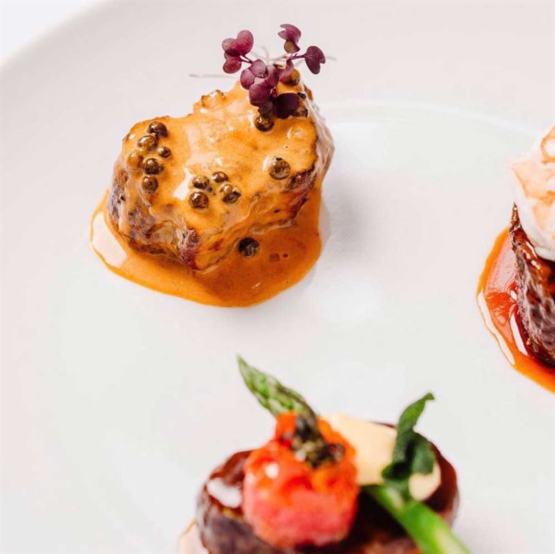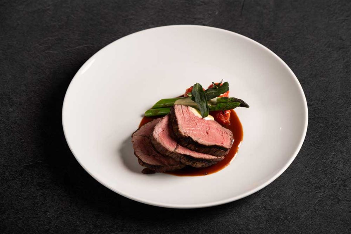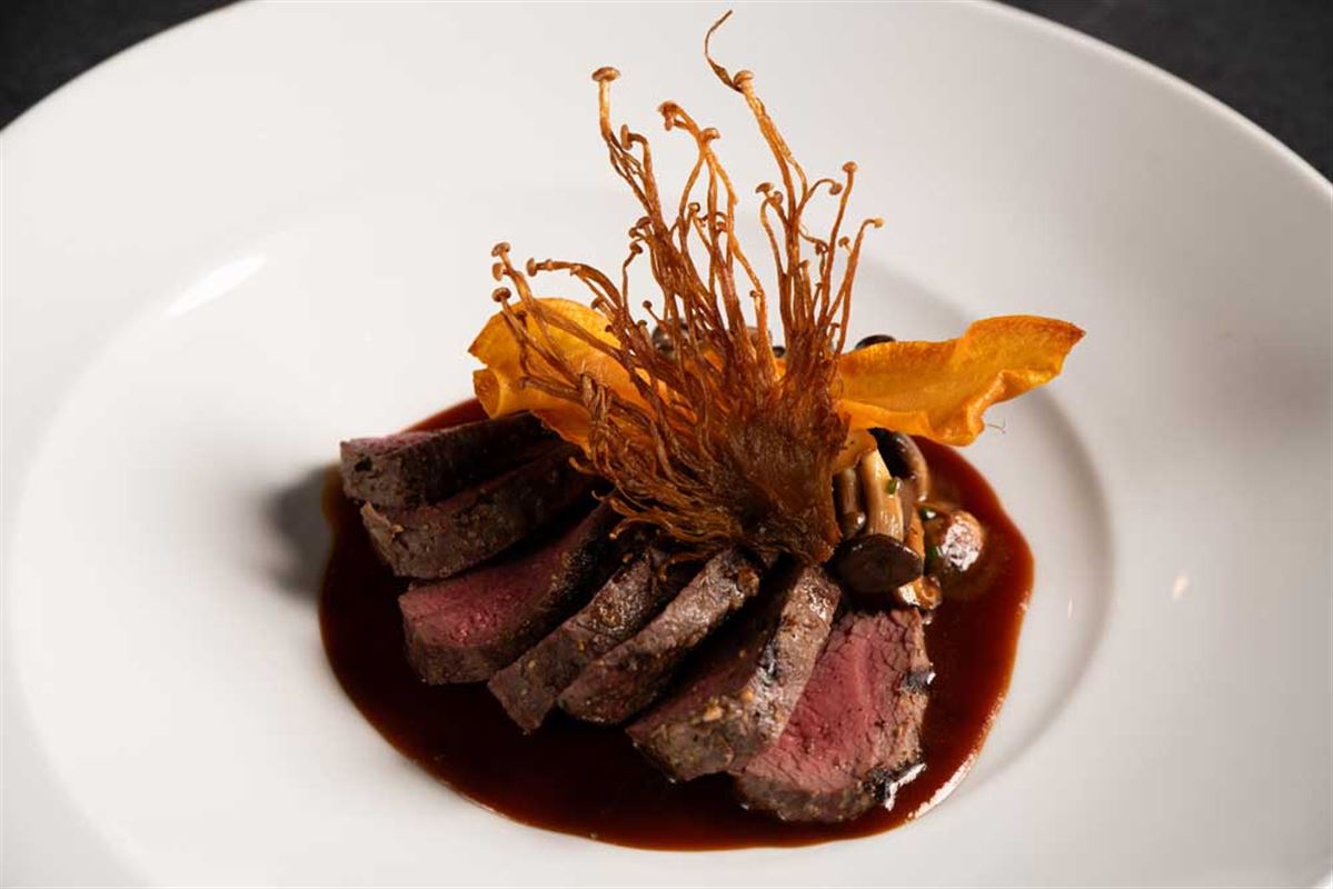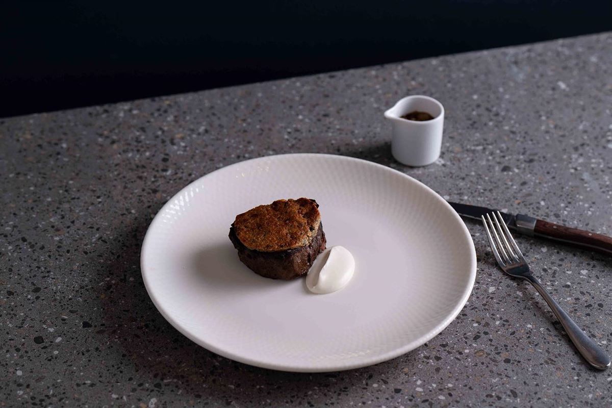 Grass-fed tenderloin, cauliflower, bone marrow crust and Bordelaise sauce.