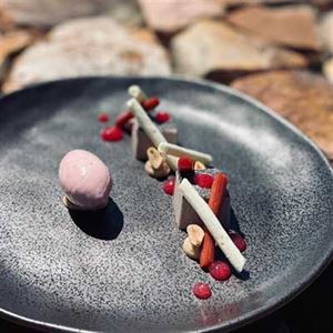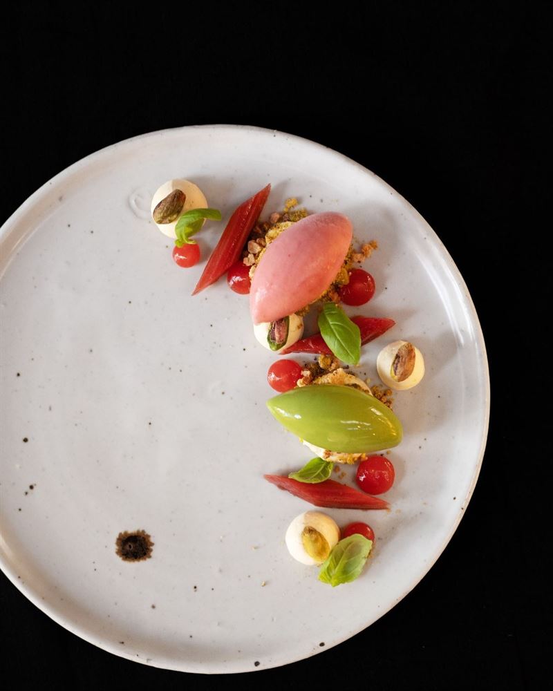 A signature decadent dessert on the menu at Mimosa Wines Restaurant, embracing rhubarb grown in the kitchen garden, mountain berries, peanut butter and orange.