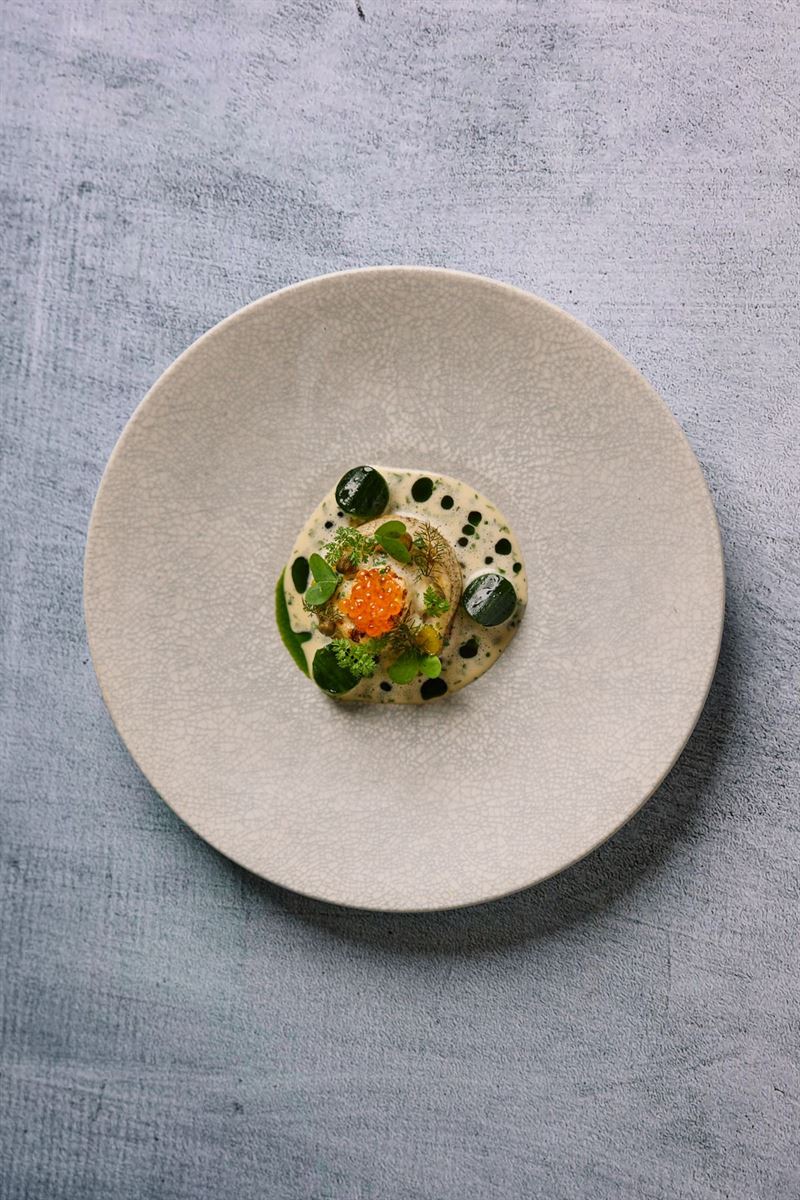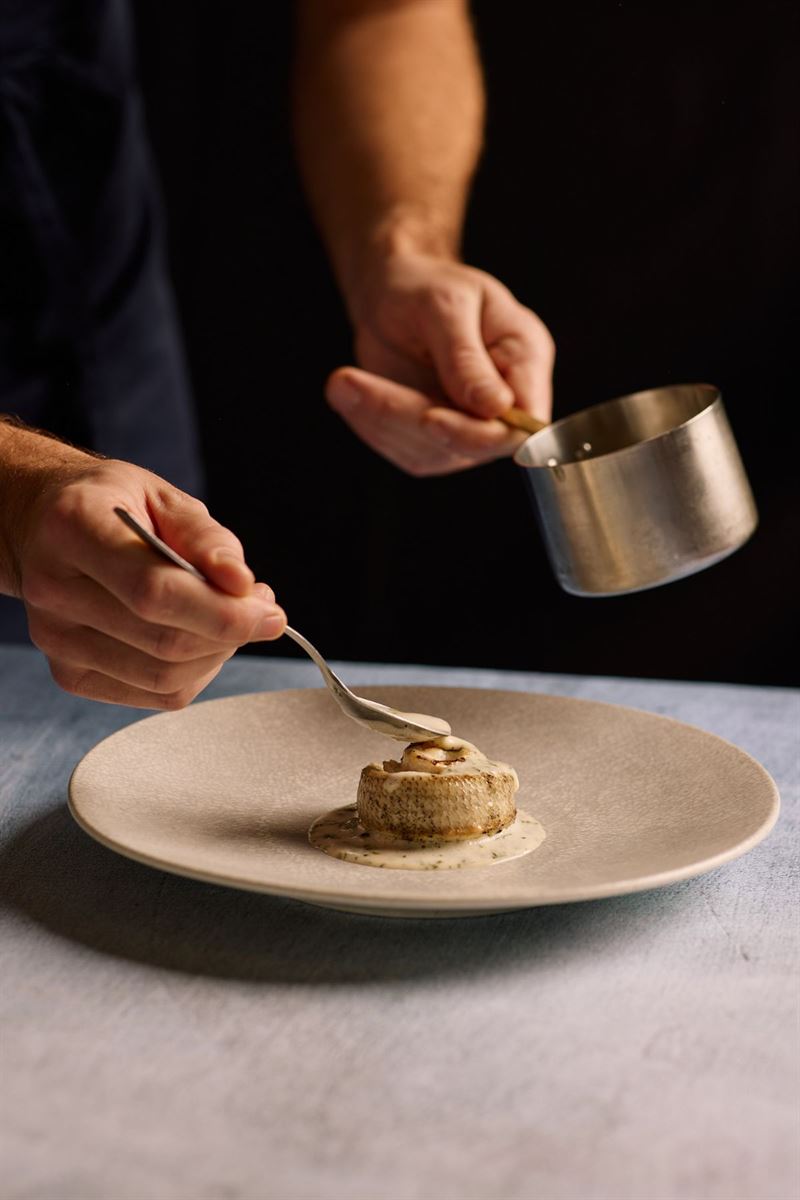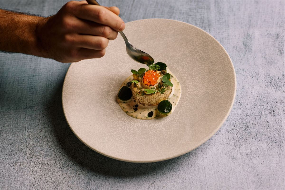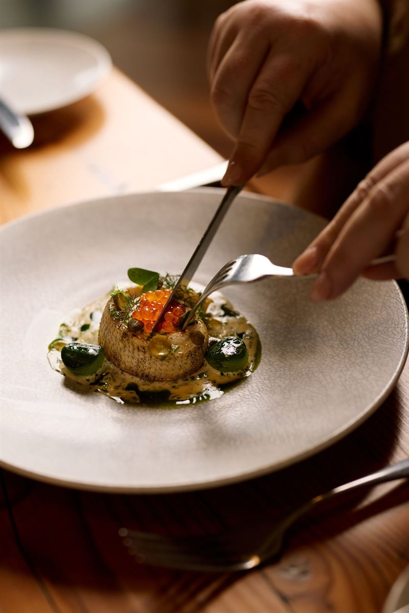 Poached Murray cod, scallop mousse, zucchini, tomato and black olive.