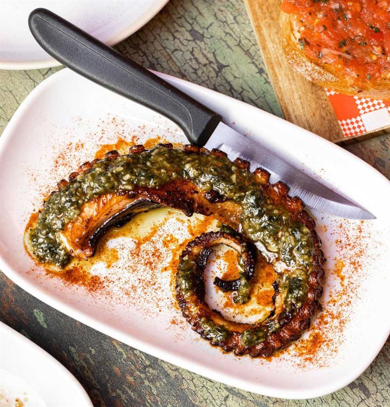Spanish tapas classics such as grilled octopus with smoked paprika and housemade mojo verde.