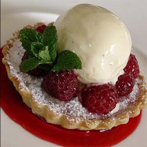 Warm raspberry and almond tart, lavender and honey ice cream, berry merlot coulis.